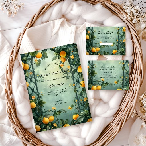 A soft and refreshing lemon-botanical design inspired by summer gardens. Lush citrus branches, white blossoms, and watercolor greenery frame your event details beautifully against a gentle mint-green background. The warm, airy aesthetic creates a charming atmosphere perfect for celebrating a mother-to-be. Elegant, fresh, and timeless—an effortless choice for a bright, nature-inspired baby shower.