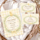 A charming vintage baby shower design featuring a sweet little duckling resting above a delicate floral wreath. Soft watercolor wildflowers and greenery frame the center, finished with a gentle ribbon bow and a warm yellow gingham background that adds a cozy nursery feel. The storybook illustration style and pastel countryside palette create a timeless, cottage-inspired look perfect for celebrating a new baby in a soft and elegant way.