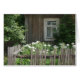 Photo d'une cabane rurale en bois avec fenêtre et jardin aux roses blanches.