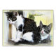 2 chatons mignons assis sur une corniche, regardant sur le côté, on a les yeux bleus, un brun. Arrière - plan jaune et blanc avec une touche de vert. A l'intérieur dit "Juste dire Salut ! " Personnalisable, vous pouvez modifier le texte, en ajouter un à l'avant, laisser vide.