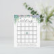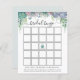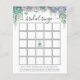 Carte de bingo de shower de mariage avec une cascade de plantes grasses violettes, vertes et bleues poussiéreuses, d'eucalyptus et de verdure. Un moyen amusant d'interagir avec les invités du shower pendant que la future mariée ouvre ses cadeaux.