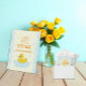 Un canard chanceux ! Premier anniversaire avec canard en caoutchouc et bulles contre un en vichy bleu clair et arrière - plan jaune pâle avec texte orange. Modèle photo via Pixabay sous licence CC0 et doit être remplacé par votre propre photo