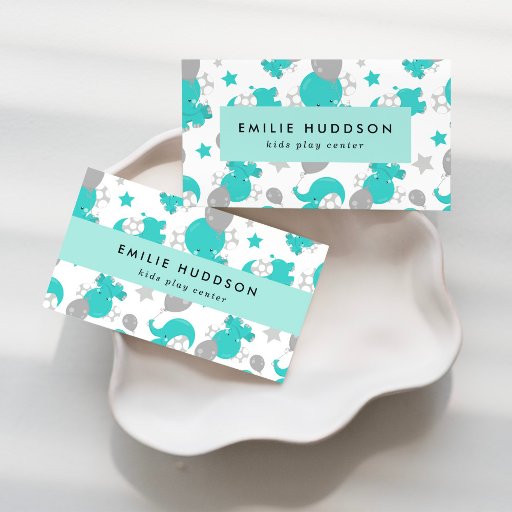 Cartes de visite mignons, amusants et adorables avec éléphants bleus, ballons et étoiles. Design moderne et tendance, parfait pour les centres de jeux pour enfants, aires de jeux, centres d'activités, garderie, baby-sitters et nounous.