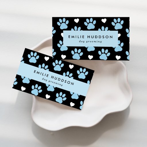 Cartes de visite mignons, amusants et adorables avec des pattes bleues et des coeurs blancs. Design moderne et tendance, parfait pour les baskets, les toiletteurs, les promeneurs de chiens, les gardiens de chiens, les animaleries et les vétérinaires.