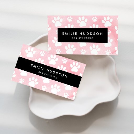 Cartes de visite mignons, amusants et adorables avec des pattes blanches et des aquarelles roses. Design moderne et tendance, parfait pour les baskets, les toiletteurs, les promeneurs de chiens, les gardiens de chiens, les animaleries et les vétérinaires.