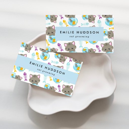 Cartes de visite mignons, amusants et adorables avec des chats, des boules de poissons et des poissons. Design moderne et tendance, parfait pour les animaleries, les chats, les chats et les éleveurs de chats.