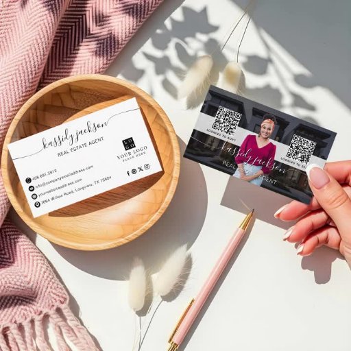 Laissez une impression durable avec notre Elegant Script Name Immobilier Photo Acheter Vendre QR Code Carte de visite. L'avant de ce carte de visite moderne dispose d'un design photo découpé personnel avec un arrière - plan personnalisable, vous permettant de télécharger votre propre image pour un look personnalisé. Votre photo personnelle est affichée avec l'arrière - plan retiré, avec l'option de supprimer l'arrière - plan dans l'outil de design Zazzle pour un effet transparent. Cette disposition polyvalente comprend de l'espace pour votre nom, titre ou slogan, ainsi que l'option d'ajouter deux codes QR distincts pour un accès facile à votre site Web, page de réservation ou médias sociaux. Le verso affiche vos coordonnées avec des icônes modernes. Parfait pour un large éventail d'industries, y compris les professionnels de la beauté et du bien-être, des consultants, des entraîneurs, des photographes, des agents immobiliers, des planificateurs d'événements et des créatifs. Entièrement personnalisable pour correspondre à votre identité de marque. Conception par © Moodthology Papery.