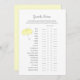 Voici une carte de jeu de baby shower Guess The Features. Parapluie jaune mignon sur un arrière - plan blanc à l'avant, arrière - plan jaune avec pois blancs à l'arrière.
