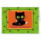 Un mignon chaton noir aux yeux verts se lèche la patte parmi un arrière - plan vert citron rempli d'araignées noires. Joyeux Halloween. Si vous avez besoin d'aide pour CUSTOMISER votre carte, veuillez demander.