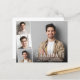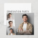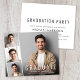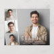 Invitation à une fête de fin d'études moderne et économique avec la photo du diplômé superposée d'une bande de trois photos carrées plus petites et « Diplômé », son nom, son école et son année de promotion en typographie blanche simple. Ajoutez les détails de la fête au verso.