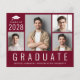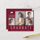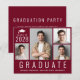 Invitation à une fête de remise de diplômes en rouge bordeaux moderne minimaliste et abordable avec un collage de 4 photos, "Diplômé" écrit en grandes lettres blanches et son année de promotion, nom et école ou université en typographie blanche simple. Ajoutez les détails de la fête au verso.