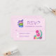Carte de réponse RSVP plate avec un arrière - plan d'aquarelle rose. Une jolie illustration de flamants avec pastèques et ananas. Aussi un trio de macarons enveloppé d'un arc.