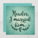 Ce design pour les amateurs de livres a la célèbre citation de la fin de Jane Eyre de Charlotte Bronte quand elle épouse M. Rochester. "Lecteur, je l'ai épousé".