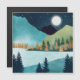 Un magnifique paysage aux textures uniques qui montre un paysage lacustre de montagne avec une lune montante et un ciel étoilé dans les tons bleu, or, vert et turquoise.