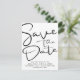 Simple Mariage Noir Et Blanc Enregistrer La Carte Date. Caractéristiques de conception de ''Save The Date''' dans une police manuscrite moderne et vos détails sur l'arrière - plan blanc. Le dos de la carte est noir profond et il ya une boîte pour des informations supplémentaires comme l'adresse du site Web etc.