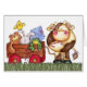 Carte mignonne de vache qui indique. vache tirant un chariot complètement des jouets.