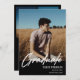 Écriture blanche moderne superposition "Graduate", faire-part de remise de diplômes de haute classe photo et invitation en noir. Lignes modèles pour le nom du diplômé, la classe de l'année et l'école. Le dos de la carte comporte 2 espaces photo supplémentaires avec des lignes de texte pour les détails de votre fête d'ouverture/remise des diplômes.