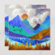 Ce magnifique design dépeint un paysage de montagne coloré avec un ciel nuageux et des collines ondulantes aux textures et couleurs audacieuses comme le bleu, le turquoise, le cyan, l'or et l'orange.