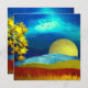 Un magnifique paysage abstrait avec un ciel unique ressemblant à des ondulations liquide et une lune, des montagnes et un arbre doré.