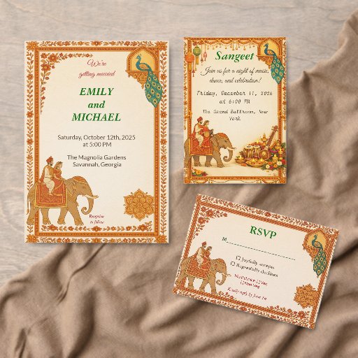 Set the tone for your royal celebration with this stunning Indian-inspired Save the Date. Featuring a majestically decorated elephant, peacocks, and luxury floral borders in saffron orange and gold. Perfect for Bollywood, Hindu, or traditional Desi weddings.