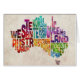 Une carte texte typographique de l'Australie. La carte est faite à partir des noms des Etats et territoires d'Australie, dans un style aquarelle urbain.