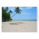 Photographie d'une plage d'île tropicale (Seychelles) aux palmiers maigres, au ciel bleu, à l'eau turquoise et au sable chaud.