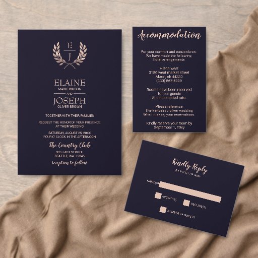 Cartes d'invitation de mariage classiques à monogramme en rose gold et marine bon marché