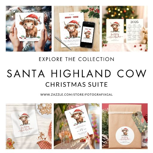 Cute Highland Nom de la vache 2026 Calendrier Joyeux Noël. Disponible numériquement et imprimé. La gentillesse festive pour vos souhaits de vacances, avec ce design amusant avec une vache des montagnes douces dans son chapeau de Santa. Joyeux Noël est dans un script moderne ensemble et personnalisez facilement votre salutation et votre nom en dessous. Un calendrier pratique pour 2026 est au verso.