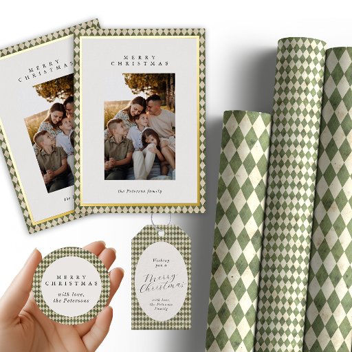 Carte de vacances motif Russe vert en détresse Jacquard avec 1 emplacement photo
