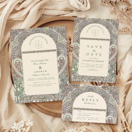 Cet élégant design de mariage présente un cadre floral Art Nouveau luxuriant aux accents doux d'olive et de sauge verte. Inspiré de gravures botaniques et de motifs européens vintages, il est parfait pour une fête romantique et intemporelle.
