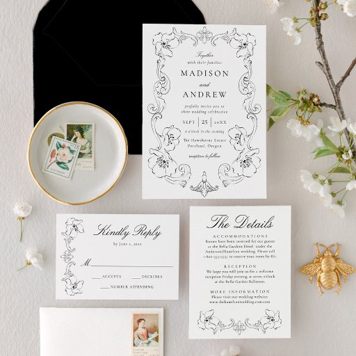 Streamline your wedding response process with this Elegant Black Ornate Frame QR Code Wedding RSVP Card, designed for couples who prefer a modern RSVP option with timeless style. A detailed black ornate floral frame surrounds the layout, creating a refined and formal presentation that pairs beautifully with classic, vintage, and estate-inspired wedding stationery. The centered QR code allows guests to quickly access your wedding website to RSVP and view important details, making this card both practical and sophisticated. Perfect for black and white wedding suites, formal venues, and couples hosting traditional or upscale weddings, this QR code RSVP card offers a polished way to share your wedding information while maintaining an elegant aesthetic.