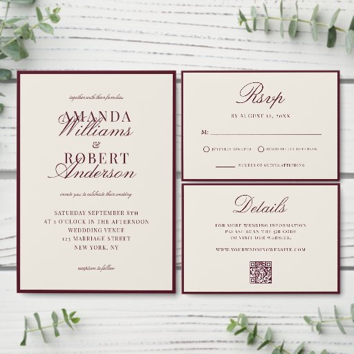 Create your own custom QR code wedding RSVP cards in a luxurious old money style and burgundy red color.
