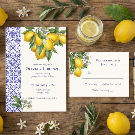 Complete your invitation suite with this matching "Mediterranean Blue & Lemon Branch" RSVP card. Featuring vibrant watercolor lemons and classic blue Azulejo tile borders, this response card is perfect for Italian destination weddings and summer celebrations.