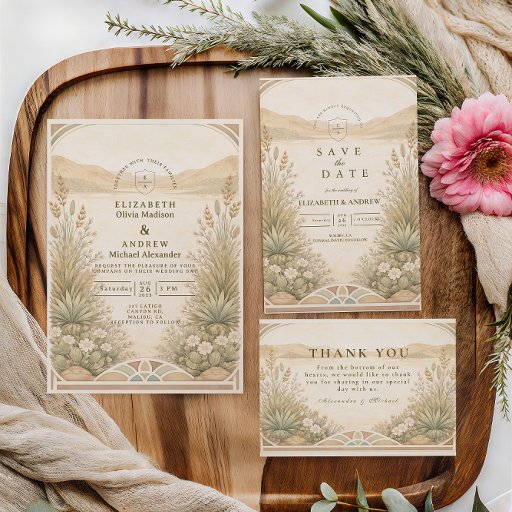 A warm, romantic wedding design inspired by desert landscapes and soft botanical florals. Illustrated wildflowers frame rolling hills in earthy, sun-washed tones, creating a refined boho aesthetic that feels natural, elegant, and timeless. Perfect for couples planning an outdoor, desert, or nature-inspired celebration with customizable details.