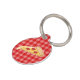 Cartoon pizzageslice met drie salamis op een rode gingham patroonachtergrond. Aan de andere kant zijn er klantgerichte tekstgebieden voor de naam van het gezelschapsdier en voor een telefoonaantal.