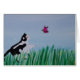 Een schattig schilderij van een zwart-witte kat die een zwarte en roze vlinder door een veld jaagt op een bewolkte dag op een kaart. Dit was een schilderij dat werd gescand in de computer.