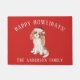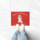 Schattige kerstdeurmat met een Cavalier King Charles Spaniel Dog met een kerstmuts op een feestelijke rode achtergrond.