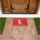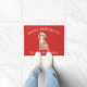 Schattige kerstdeurmat met een Cavapoo Dog met een kerstmuts op een feestelijke rode achtergrond.