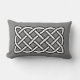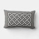 Lumbarkussen in een Keltisch, rechthoekig, ononderbroken knoop patroon, symboliserend heilige meetkunde en de verbondenheid van al het leven in het universum - wit patroon in zwart geschetst op een grafietgrijze / grijze achtergrond