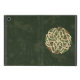 Een traditioneel Keltisch siermiddel dat vier draak- of snakelike wezens toont die in Keltische knopen zijn verweven om een ingewikkelde cirkel te vormen. Het siermiddel wordt getextureerd in groene en blikken op een achtergrond van donkergroen met decoratieve textuur.
