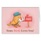 Une carte de vœux douce et mignonne avec un petit oiseau jaunâtre orange portant un chapeau de facteur et avec un sac à bandoulière se dirigeant vers la boîte aux lettres du destinataire pour y déposer une lettre d'amour. La légende humoristique et pun correspondante indique "Certains Oiseaux T'aiment!" Une excellente idée de confession amoureuse pour la Saint-Valentin ou une occasion romantique! Personnalisez le nom sur la boîte aux lettres rouge!