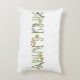 Coussin avec accent blanc avec texte décoratif avec baies, spriges de feuilles, un cerf, poire, flocons de neige et texte vert qui dit NOËL!