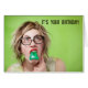 Une femme à l'air nerveux avec une gousse de détergent dans la bouche disant C'est ton anniversaire ! L'intérieur dit : "Amusez-vous bien ! Mais ne faites rien de stupide !"