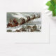 Illustration vintage du Père Noël qui est d'apparence naturelle et plein de détails. Père Noël monte son traîneau plein de rennes et un sac de jouets, sur une scène enneigée nuageuse au clair de lune en dessous. Une charmante et grande maison victorienne est sa prochaine étape pour livrer des jouets et des bonbons. St. Nick se réchauffe avec une très grande couverture en fourrure. Il sort de sa traîne de nombreux jouets, dont un cheval à bascule, des poupées pour bébé, un tambour de jouets et une maison de poupées.