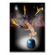 Schroefende Chihuahua die met een opvlammende ketting zwaait terwijl hij op een grote blauwe bal onder de grote bovenkant van het circus balanceert