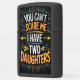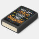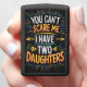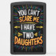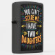 Een krijtbord met kleurrijke krijttekeningen die zeggen dat je me niet bang kunt maken. Ik heb twee dochters. De zin is geschreven in een vet, speels lettertype.