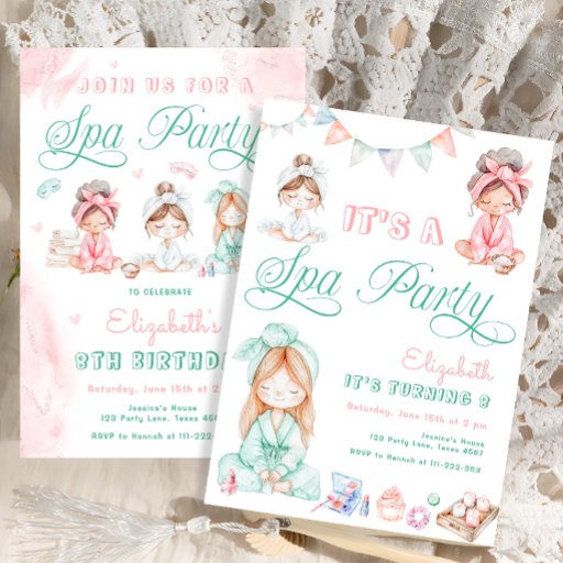 Ce design d’anniversaire sur le thème du spa capte l’essence de la détente et du plaisir, en utilisant une palette rêvée de couleurs pastel douces - roses rousses, violets lavande, verts menthe et bleus du ciel - pour créer une ambiance apaisante et ludique, parfaite pour la célébration d’une fille. Les éléments aquarelles apportent une touche artistique et fantaisiste, rendant le design léger et aéré. Ce design allie l'autosoin à la célébration, créant un environnement parfait pour une fête d'anniversaire de spa relaxante mais amusante. Éléments correspondants disponibles.