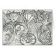 Image Drypoint d'un chat avec des montagnes derrière et des images de rêve tout autour.