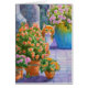 Un chat orange qui regarde derrière des fleurs en pot sur un patio. Visitez Cat-Paintings.com pour plus d'aquarelles de chat gingembre.