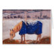En retard un après-midi neigeux du Vermont, un cheval blanc se tient mangeant le foin, confortable dans sa couverture bleue. Une peinture de gouache du carnet à dessins d'Ashley.